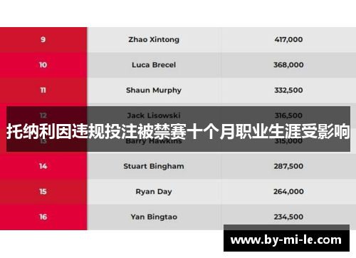 托纳利因违规投注被禁赛十个月职业生涯受影响